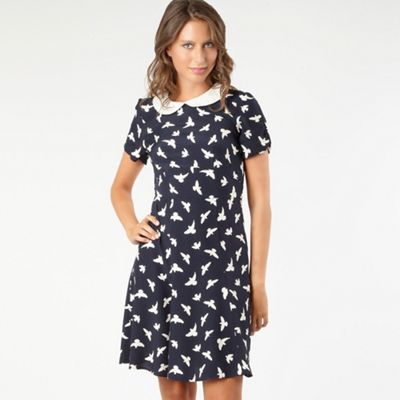 Winging its way back to the 60s and ticking all the trend boxes is this Navy printed Peter Pan collar dress This navy printed dress from Red Herring features a white bird print design, a Peter Pan collar with a vintage lace trim, ruched short sleeves, a sash tie to the waist and a classic pleated skirt with a light flare. You may also like the Black Spotted Tunic dress and Black 60s knitted dress both in "Swinging London" Style.
